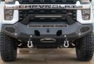 The next Evolution in Winch bumpers is here, with Road Armor's Evolution Series. Style is king and quality is the standard utilizing the Evolution Series your truck will stand out. with a bold new stature. Available in pre-runner with or without reaper bar, and in full guard. Your trail on night runs is illuminated by integrated light mounts for a single-row 30 in. light bar, and end pods that sport options for either a single 4 in. light bar or dual 3 in. cubes, all secured by our laser-cut Hyve mesh and accented with integrated 8 in. LEDs. Never ones to forego safety and function over style, the Evolution Series supports factory sensors, is built with high-strength American steel, and are made road-ready with our 9-stage powder coating process.