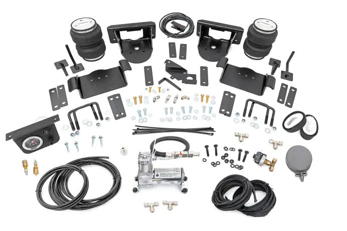 Ideal Leveling: Is your truck your workhorse? The main attraction of a pickup is the ability to haul and tow as needed. However, due to the weight in the bed or the condition of the rear leaf springs, your vehicle may become un-level under load. At Rough Country, we've designed a solution to eliminate these concerns. Introducing Rough Country's Rear Air Spring Kit. Heavy-Duty Construction: Rough Country's Rear Air Spring Kit includes two high-quality, double convoluted air bags, reinforced with durable powder-coated steel brackets and DOT-approved airlines. Whether you're towing a trailer or hauling heavy loads, this kit helps ensure your vehicle remains level, alleviating the strain on your trailer's tongue weight. The kit features 1/4" push-to-connect air fittings for easy installation, along with all necessary bracketry for a secure fit. Rough Country's Air Spring Kit supports up to 5,000 lbs. of load, minimizing sway and preventing bottoming out while braking and steering. Easy Installation: Quick and simple setup for immediate use. Rough Country's kit can be installed at home with standard tools in just 5-6 hours, ensuring minimal downtime and fast, hassle-free installation. Onboard Air Compressor and Wireless Controller: For added convenience, Rough Country offers an optional onboard air compressor and wireless controller to easily adjust your air spring kit on the go. Control air pressure at the push of a button from the comfort of your vehicle. Reliable Warranty Coverage: Rough Country's Rear Air Spring Kit includes a limited lifetime warranty on the air springs and a two-year replacement warranty on the compressor, offering lasting protection against manufacturer defects. This industry-leading coverage ensures confidence in both quality and durability, so you can count on Rough Country to keep your truck performing at its best.