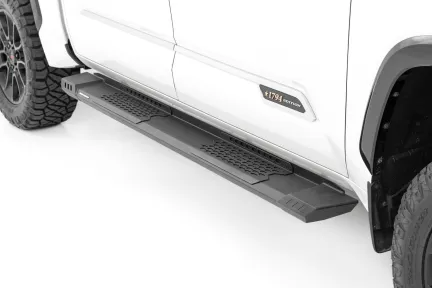 Swap out your skinny, factory running boards with Rough Country's wider and more aggressive HD2 Running Boards! These beefy, cab-length running boards make it much easier to get in and out of your truck.