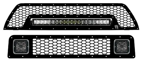 our original 10" E-Series light with two D-series lights. Two-piece 100% stainless steel construction with durable UV-protected and scratch resistant powder coat. All stainless steel hardware with no welds! Full grille replacement -- requires cutting of factory grille shell.